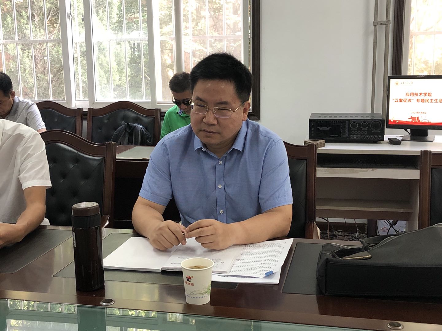 王宇首先代表学院作“以案促改”对照检查。他简要通报此次民主生活会的前期准备工作、专题学习教育情况,以及2018年、2019年专题民主生活会所提出的问题整改情况。对照“两个维护”、政治纪律和规矩、廉洁自律、作风建设、担当作为、全面从严治党六个方面,检视了学院领导班子存在的主要问题并剖析问题根源,同时针对问题提出了整改措施。