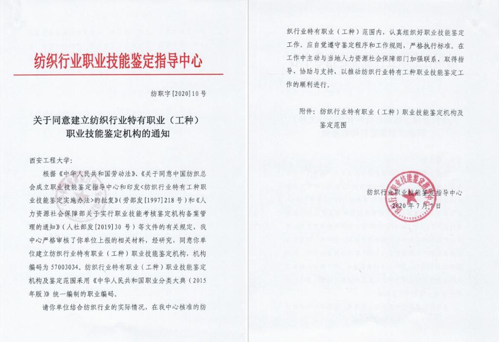 为切实加强必赢官网继续教育人才培养与劳动就业的联系,推进校企合作、产学研结合,充分发挥学校继续教育服务地方经济社会的职能,全面提升纺织行业从业人员的综合素质、职业能力和社会竞争力,根据纺织行业职业技能鉴定指导中心《关于申请设立纺织行业职业技能鉴定机构的通知》(纺职字〔2019〕15号)以及《人力资源和社会保障部关于实行职业技能考核鉴定机构备案管理的通知》(人社部〔2019〕30号)文件精神,必赢官网在充分调研的基础上,结合纺织服装行业的办学特色以及雄厚的师资力量,学校联合我省多家纺织企业,积极组织撰写申报材料,成功获批“纺织行业职业技能鉴定所”,开展陕西境内乃至西北地区纺织服装从业人员职业技能鉴定的组织、考试和协调管理工作。