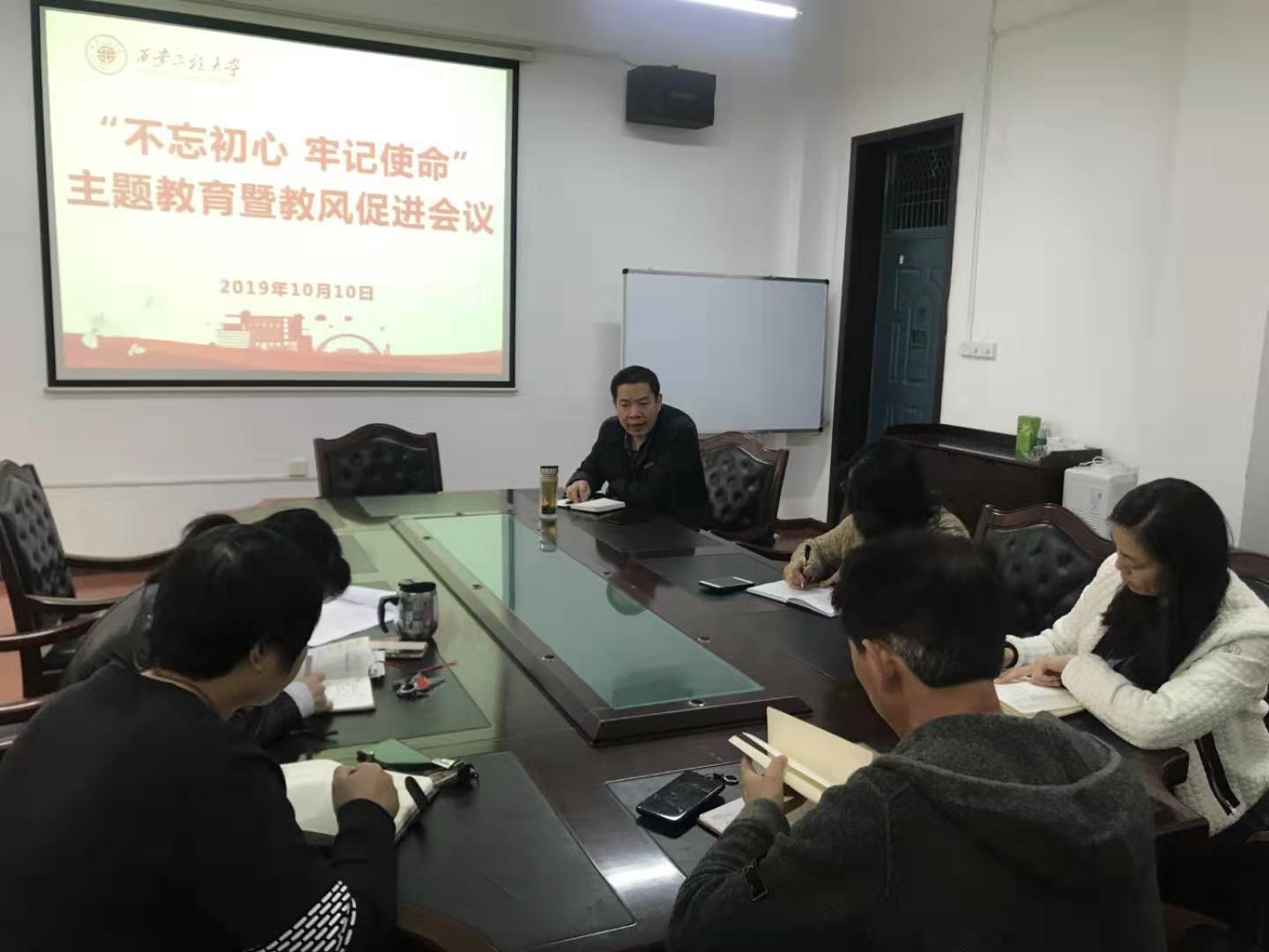 10月10日上午,565net必赢客户端在会议室召开“不忘初心、牢记使命”主题教育暨教风建设促进会议,学院全体专兼职教师、学院教务科和实验室负责人以及学院相关领导参加了会议。会议由副院长刘玉森主持。