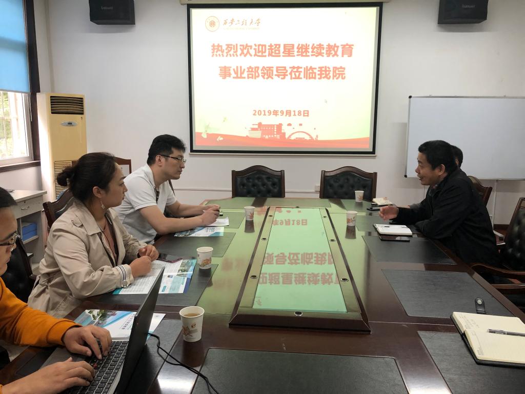 2019年9月18日下午,北京超星公司继续教育事业部副总经理马文华一行三人来必赢官网商谈继续教育合作相关事宜。双方的合作交流座谈在学院会议室召开,学院副院长刘玉森、学院培训部、成人招生负责人等参加了此次座谈,座谈由刘玉森主持。